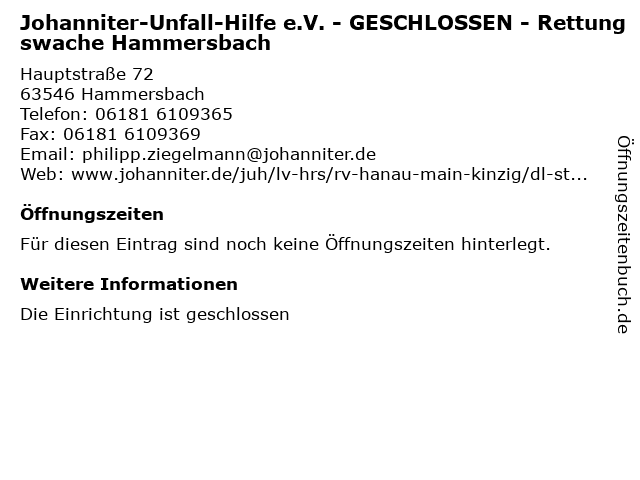 | Johanniter-Unfall-Hilfe e.V. - GESCHLOSSEN - Rettungswache Hammersbach anrufen | |