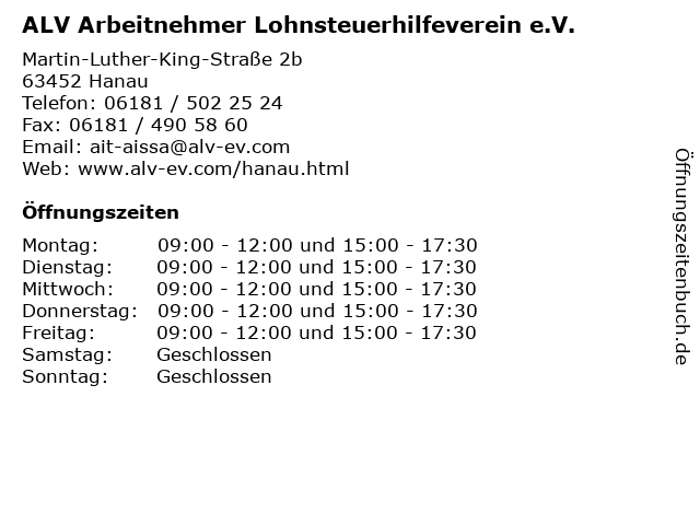 2 Lohnsteuerhilfeverein Arbeitnehmer Lohnsteuerhilfe Hessen e.V. Beratungsstelle Hanau (Entfernung: 1,09 km) Hanauer Vorstadt 15, 63450 Hanau 3 Lohnsteuerberatungsverbund e. V. -Lohnsteuerhilfeverein- Beratungsstelle Hanau (Entfernung: 1,54 km) Gärtnerstraße 46B, 63450 Hanau 4 Lohnsteuerhilfeverein Vereinigte Lohnsteuerhilfe e.V. - GESCHLOSSEN (Entfernung: 5,49 km) Schießstr. 67, 63486 Bruchköbel 5 Lohnsteuerhilfeverein Arbeitnehmer Lohnsteuerhilfe Hessen e.V. Beratungsstelle Maintal (Entfernung: 6,79 km) Stresemannstr. 27, 63477 Maintal 6 |