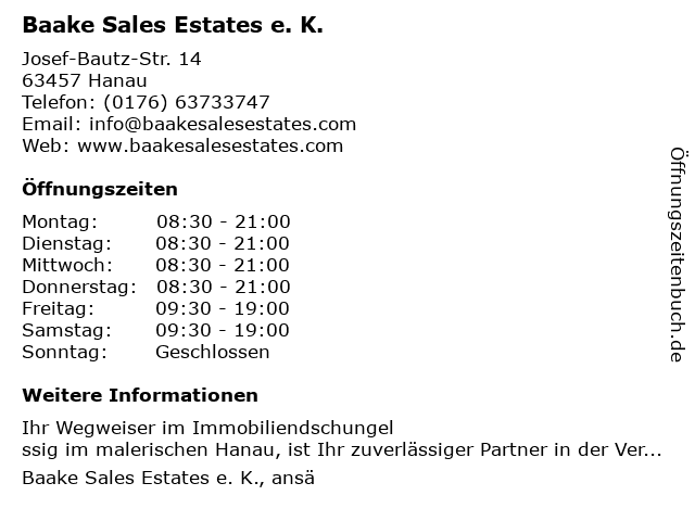 | Öffnungszeiten Baake Sales Estates e. K. in Hanau anzeigen | |