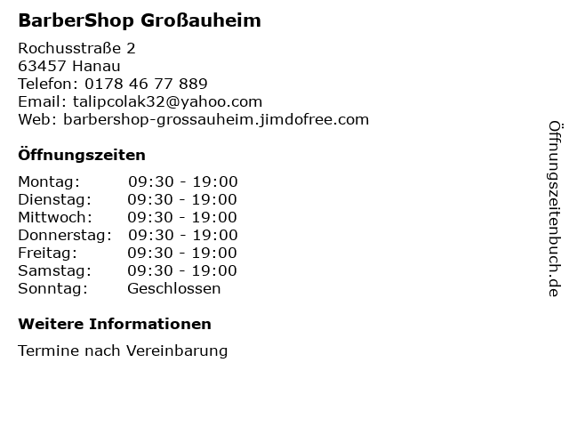 | Öffnungszeiten BarberShop Großauheim in Hanau anzeigen | |