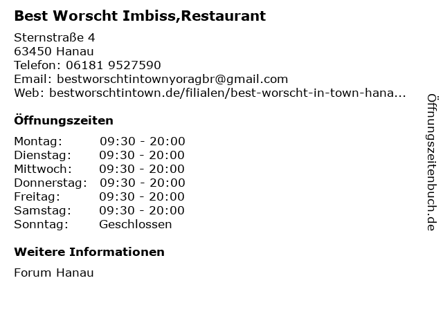 | Öffnungszeiten Best Worscht Imbiss,Restaurant in Hanau anzeigen | |