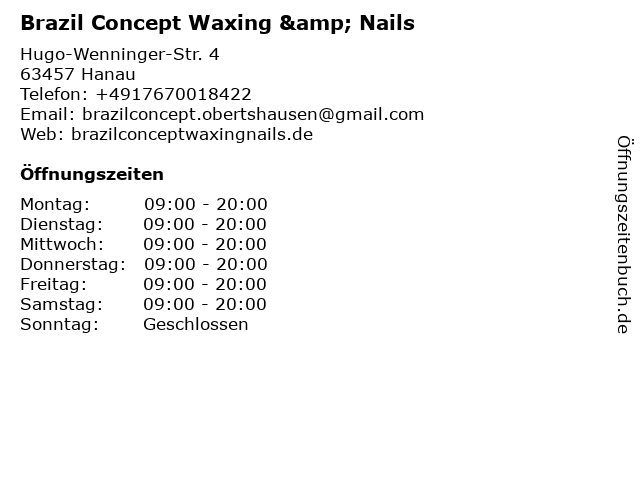 | Öffnungszeiten Brazil Concept Waxing & Nails in Hanau anzeigen | |