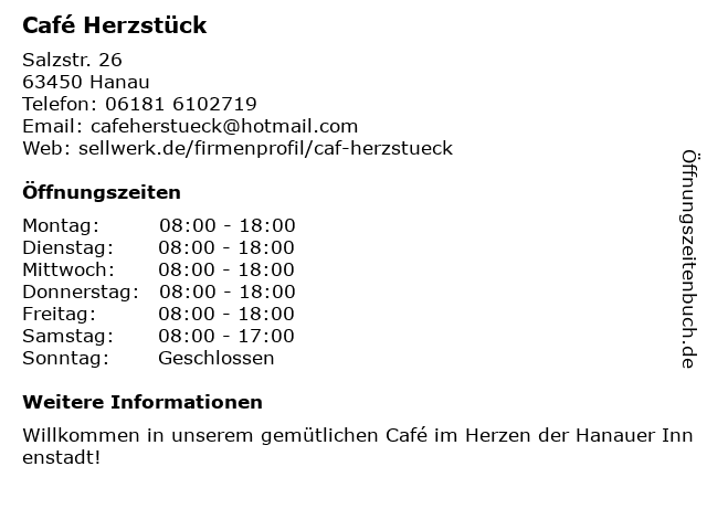 | Öffnungszeiten Café Herzstück in Hanau anzeigen | |