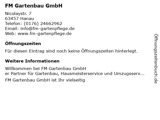 Öffnungszeiten FM Gartenbau GmbH in Hanau anzeigen | |