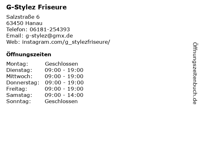 | Öffnungszeiten G-Stylez Friseure in Hanau anzeigen | |