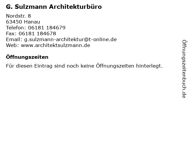| Öffnungszeiten G. Sulzmann Architekturbüro in Hanau anzeigen | |