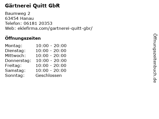 | Öffnungszeiten Gärtnerei Quitt GbR in Hanau anzeigen | |