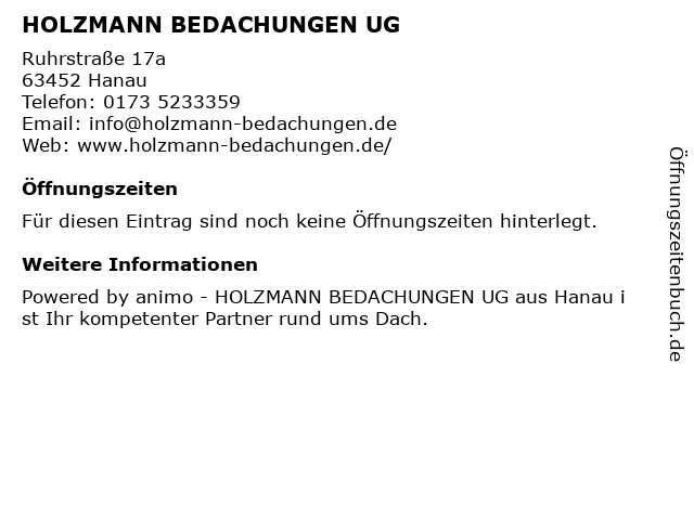 | Öffnungszeiten HOLZMANN BEDACHUNGEN UG in Hanau anzeigen | |