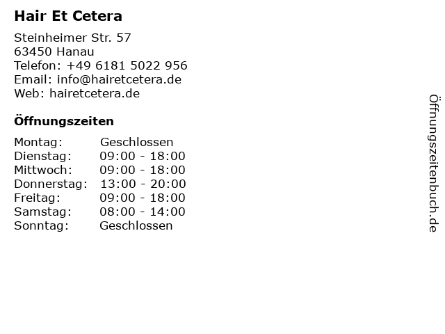 | Öffnungszeiten Hair Et Cetera in Hanau anzeigen | |
