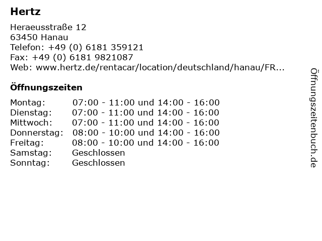 | Öffnungszeiten Hertz in Hanau anzeigen | |
