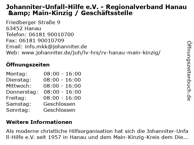 Branchen & Suchbegriffe zu Johanniter-Unfall-Hilfe e.V. - Regionalverband Hanau & Main-Kinzig / Geschäftsstelle:e.v., gemeinnützige organisation, geschäftsstelle, hilfe, hilfsorganisation, johanniter, kinzig, main, regionalverband, sozialarbeit, unfall, verband, wohlfahrtseinrichtung |