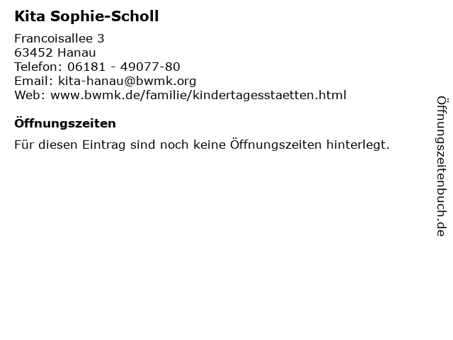 | Öffnungszeiten Kita Sophie-Scholl in Hanau anzeigen | |