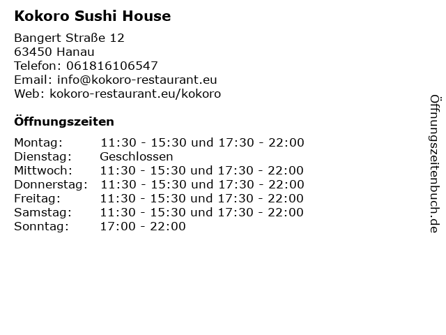 | Öffnungszeiten Kokoro Sushi House in Hanau anzeigen | |