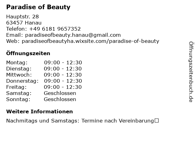| Öffnungszeiten Paradise of Beauty in Hanau anzeigen | |