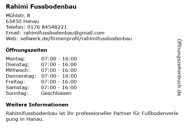 | Öffnungszeiten Rahimi Fussbodenbau in Hanau anzeigen | |