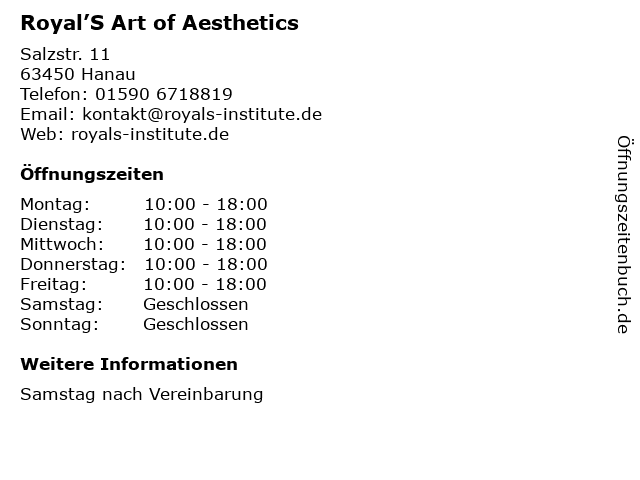 | Öffnungszeiten Royal’S Art of Aesthetics in Hanau anzeigen | |