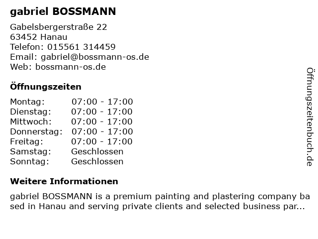 | Öffnungszeiten gabriel BOSSMANN in Hanau anzeigen | |