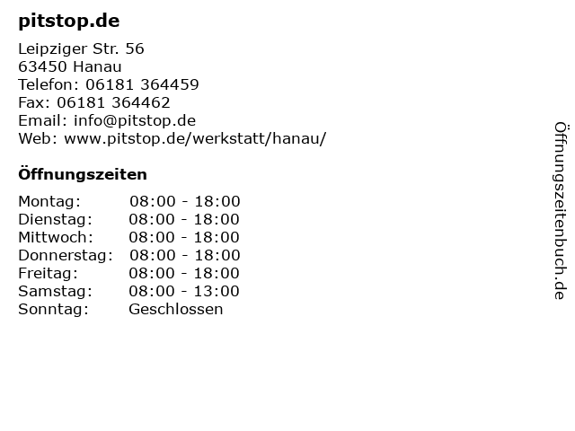 | Öffnungszeiten pitstop.de in Hanau anzeigen | |