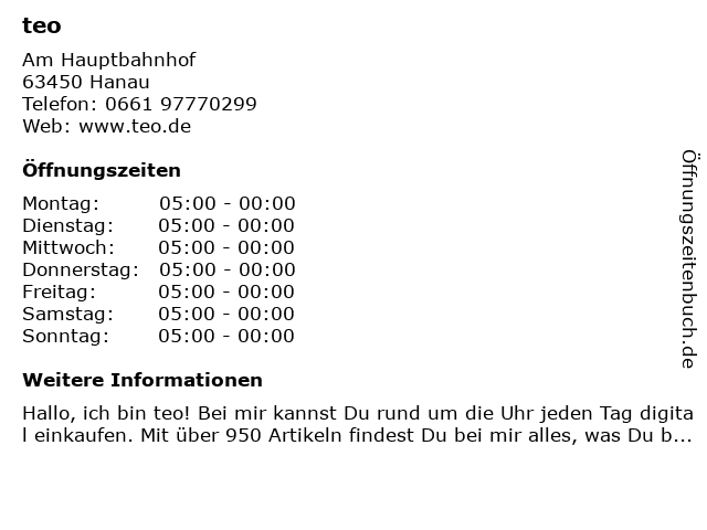 | Öffnungszeiten teo in Hanau anzeigen | |