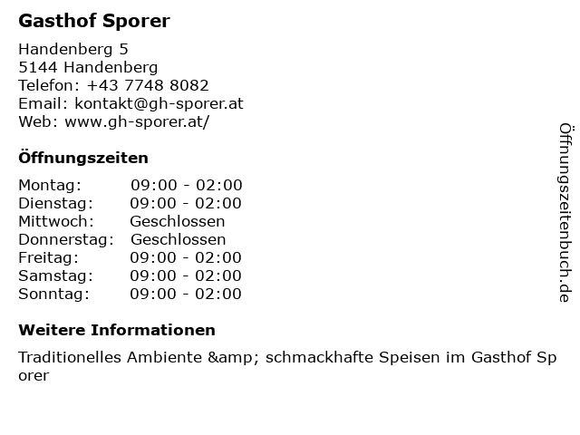 | Öffnungszeiten Gasthof Sporer in Handenberg anzeigen | |