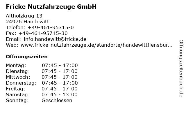 | Öffnungszeiten Fricke Nutzfahrzeuge GmbH in Handewitt anzeigen | |