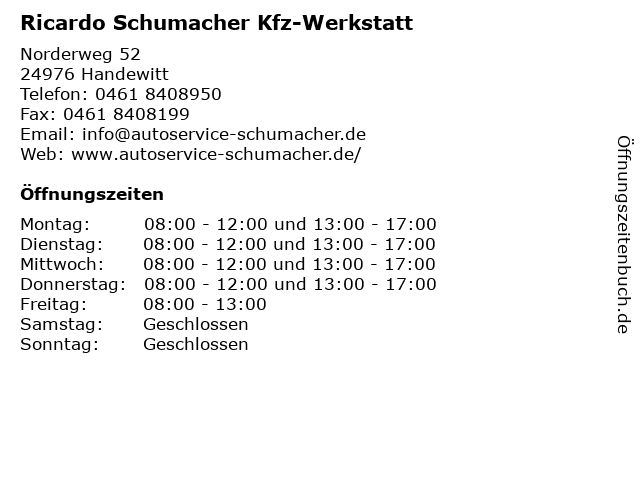 2 Autoservice und KFZ-Meisterbetrieb Schumacher (Entfernung: 2,86 km) Max-Planck-Straße 2, 24941 Flensburg 5 Klaus Peter Schumacher + Ute Schuster Sport- u. Freizeitmoden (Entfernung: 12,91 km) Schinderdam 7, 24960 Glücksburg 6 |