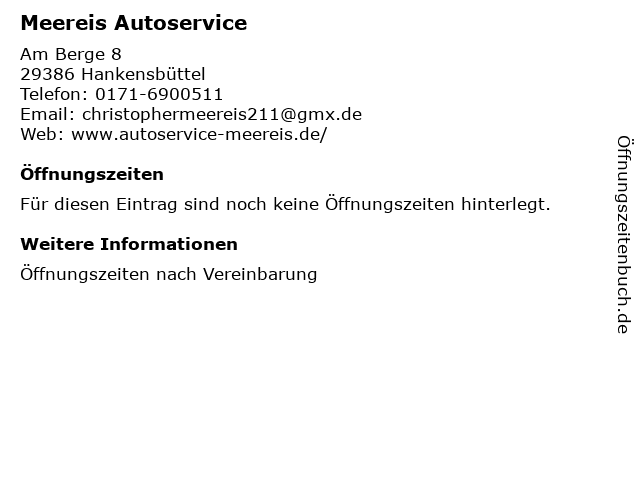 | Öffnungszeiten Meereis Autoservice in Hankensbüttel anzeigen | |