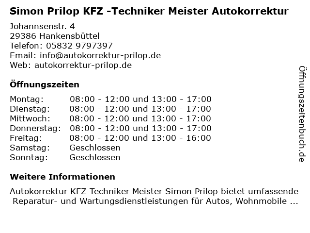 Branchen & Suchbegriffe zu Simon Prilop KFZ -Techniker Meister Autokorrektur:autokorrektur, kfz, meister, prilop, simon, techniker |