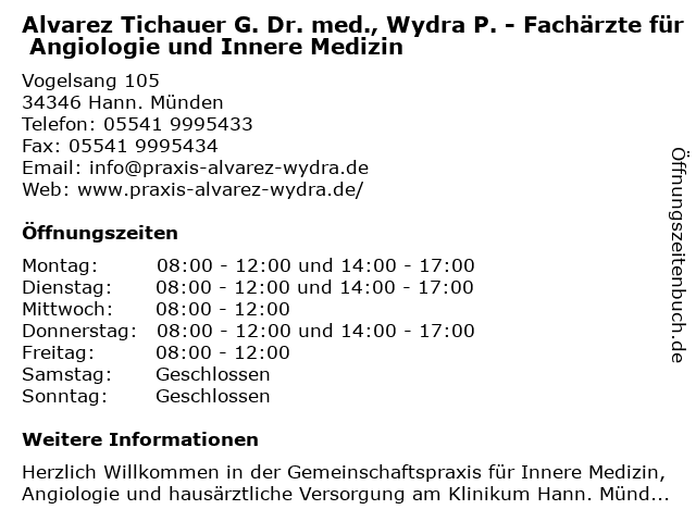 Branchen & Suchbegriffe zu Alvarez Tichauer G. Dr. med., Wydra P. - Fachärzte für Angiologie und Innere Medizin:alvarez, angiologie, dr., fachärzte, g., innere, med., medizin, p., tichauer, wydra |