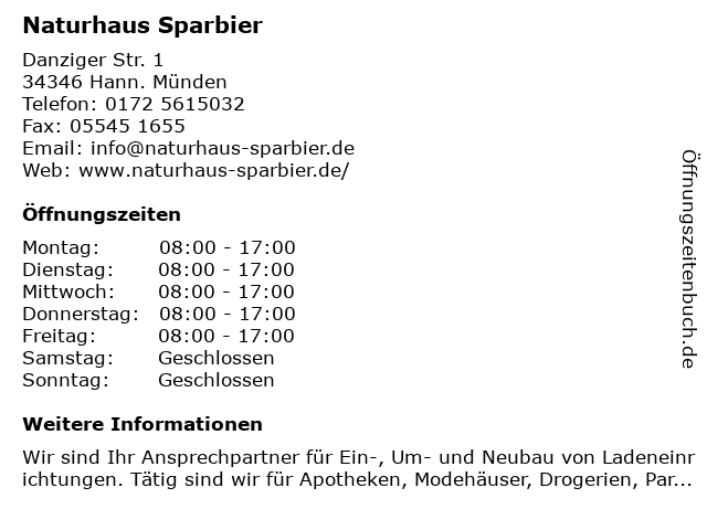 | Öffnungszeiten Naturhaus Sparbier in Hann. Münden anzeigen | |