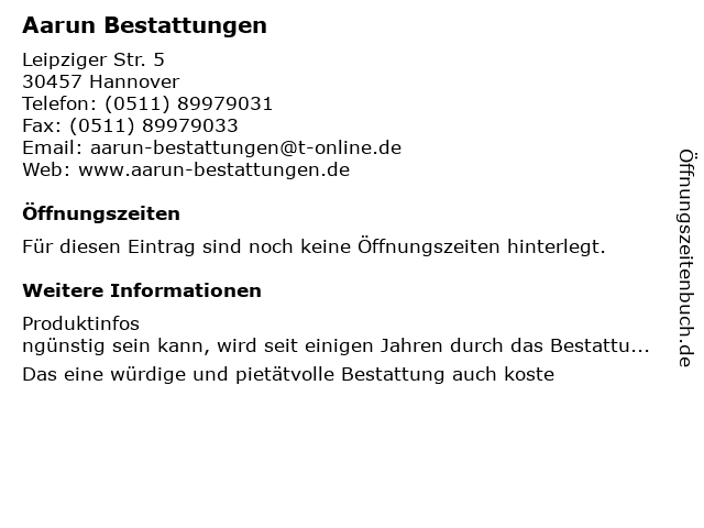 | Öffnungszeiten Aarun Bestattungen in Hannover anzeigen | |