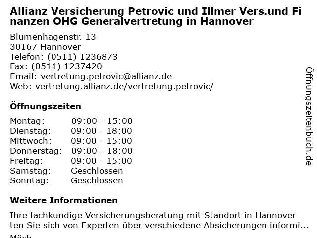 Branchen & Suchbegriffe zu Allianz Versicherung Petrovic und Illmer Vers.und Finanzen OHG Generalvertretung in Hannover:allianz, baufinanzierungen, berufsunfähigkeitsversicherung, betriebliche altersvorsorge, betriebliche krankenversicherung, betriebsunterbrechungsversicherungen, cyberversicherung, ertragsausfallversicherung, finanzanlagen, finanzanlagenberater, finanzen, firmenversicherung, generalvertretung, haftpflichtversicherungen, hausratversicherungen, illmer, kfz-versicherungen, petrovic, private krankenversicherung, privatversicherung, rechtsschutz, reiserücktrittsversicherung, rentenversicherungen, tierhalterhaftpflichtversicherung, tierkrankenversicherungen, vers.und, versicherung, zahnzusatzversicherung |