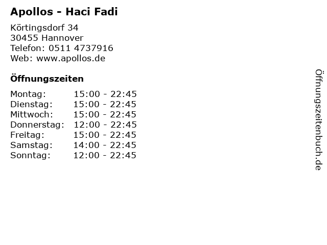 | Öffnungszeiten Apollos - Haci Fadi in Hannover anzeigen | |