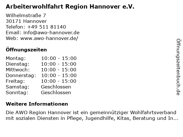 3 AWO Region Hannover e.V. - Familien- und Sozialberatungsstelle (Anmeldung) (Entfernung: 0,10 km) Marienstraße 20, 30171 Hannover 4 Arbeiterwohlfahrt KV Hannover-Stadt e.V. Familien -und Sozialberatung (Entfernung: 0,10 km) Marienstr. 22, 30171 Hannover 6 |