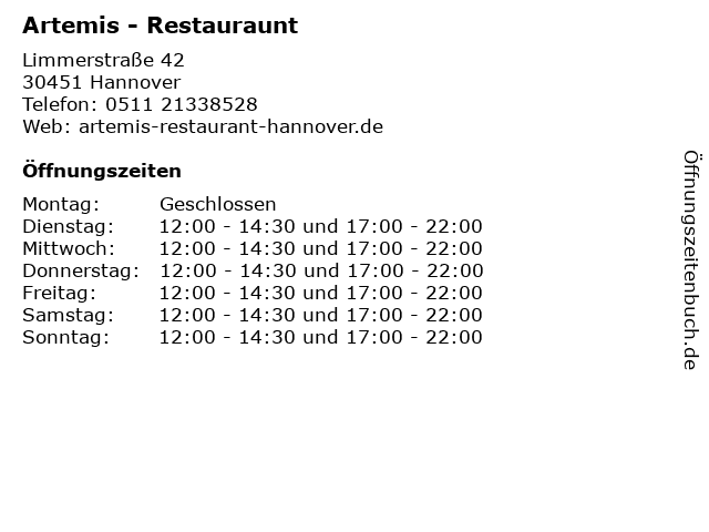 | Öffnungszeiten Artemis - Restauraunt in Hannover anzeigen | |