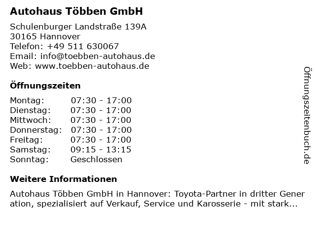 | Öffnungszeiten Autohaus Többen GmbH in Hannover anzeigen | |