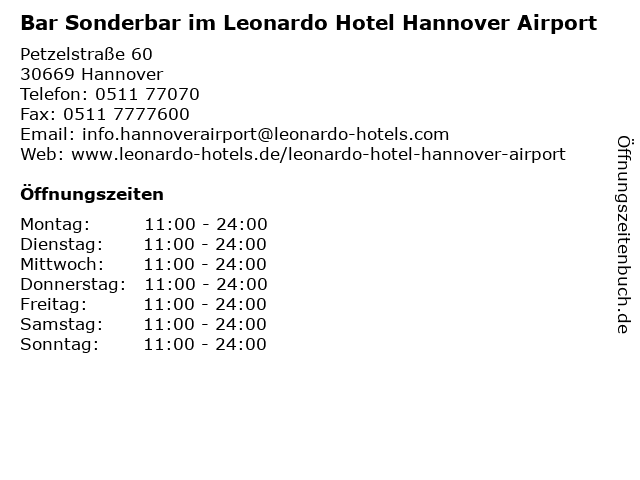 2 Restaurant Prasserie im Leonardo Hotel Hannover Airport (Entfernung: 0,00 km) Petzelstraße 60, 30669 Hannover 6 Leonardo Glas und Geschenke GmbH (Entfernung: 9,68 km) Niki-de-Saint-Phalle-Promenade 44c, 30159 Hannover |