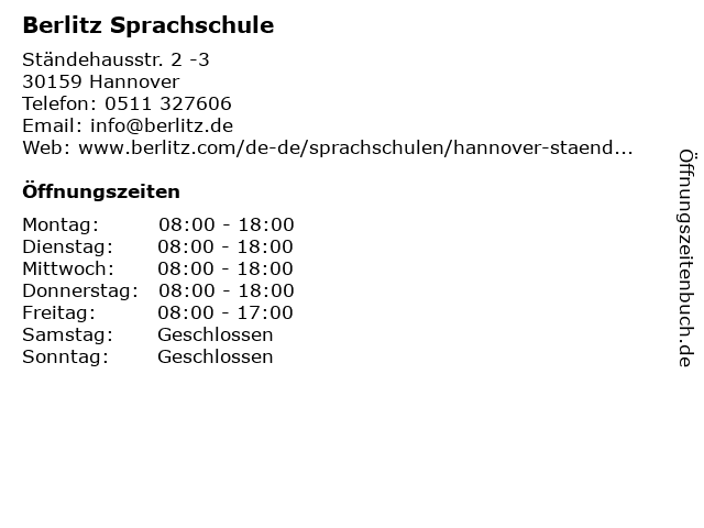 | Öffnungszeiten Berlitz Sprachschule in Hannover anzeigen | |