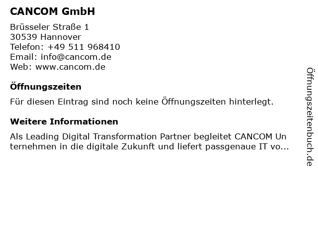 | Öffnungszeiten CANCOM GmbH in Hannover anzeigen | |