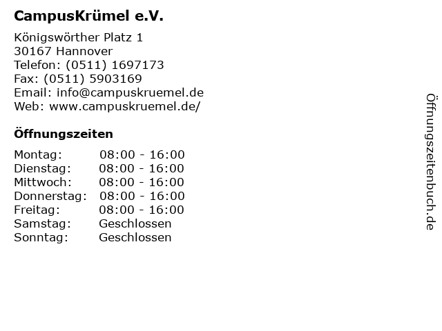 | Öffnungszeiten CampusKrümel e.V. in Hannover anzeigen | |