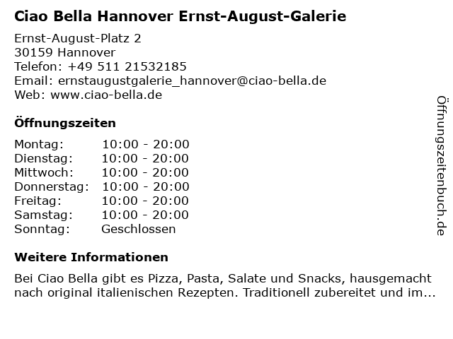 Branchen & Suchbegriffe zu Ciao Bella Hannover Ernst-August-Galerie:august, bella, ciao, ernst, galerie, italienisch, pasta, pizza, restaurant, salat, to go, vegetarisch |