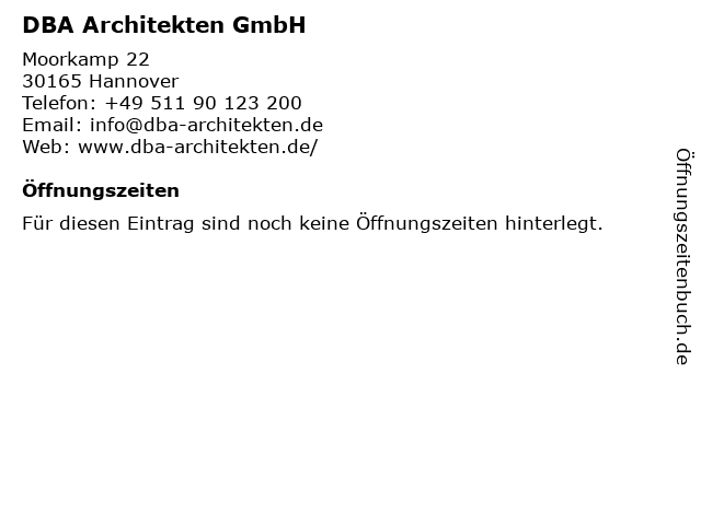 | Öffnungszeiten DBA Architekten GmbH in Hannover anzeigen | |