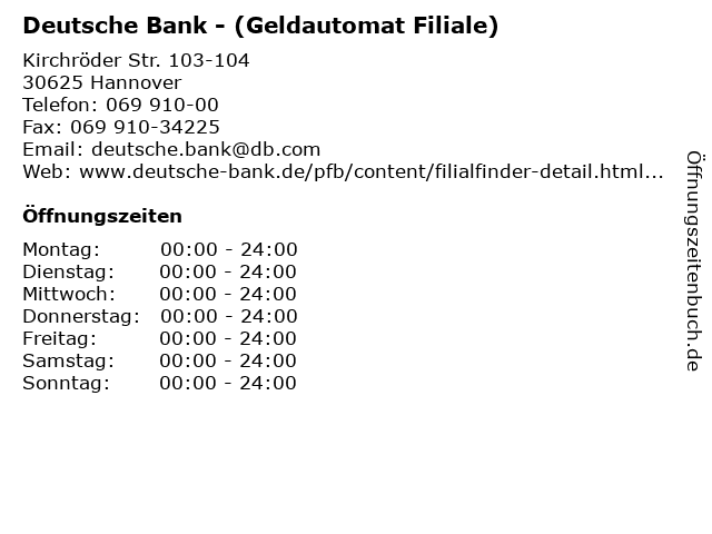 2 Deutsche Bank Gruppe Investment & FinanzCenter (Entfernung: 0,02 km) Kirchröder Straße 103, 30625 Hannover 3 Sparkasse Hannover (SB-Angebot (Für Beratung an diesem Standort bitte Termin vereinbaren)) (Entfernung: 0,08 km) Scheidestraße 21, 30625 Hannover 5 Commerzbank Hannover-Kleefeld - (Geldautomat Filiale) (Entfernung: 0,20 km) Scheidestrasse 3, 30625 Hannover 6 |