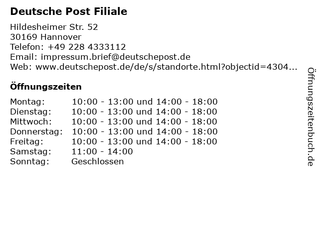 Öffnungszeiten Deutsche Post Filiale in Hannover anzeigen | |