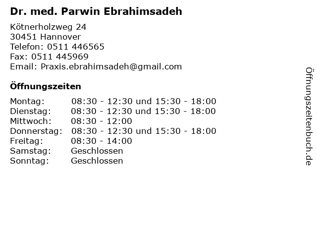 | Öffnungszeiten Dr. med. Parwin Ebrahimsadeh in Hannover anzeigen | |