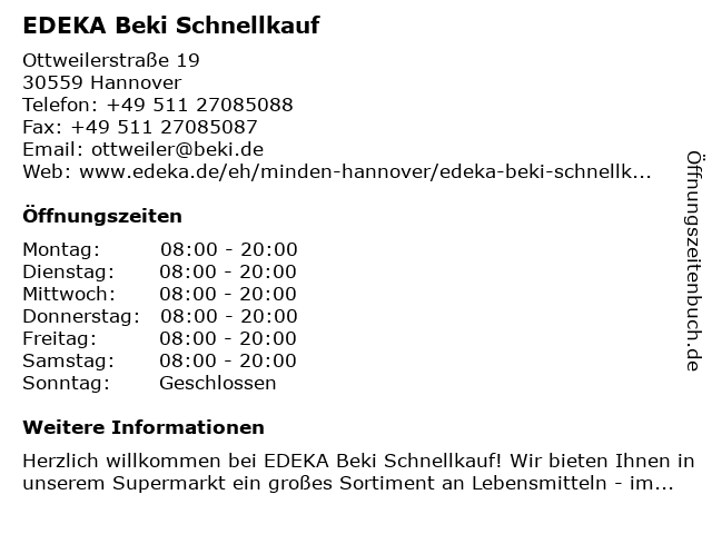 | Öffnungszeiten EDEKA Beki Schnellkauf in Hannover anzeigen | |