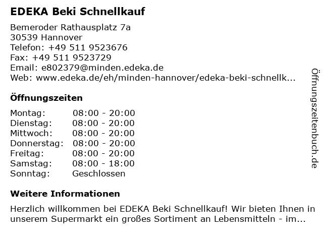 | Öffnungszeiten EDEKA Beki Schnellkauf in Hannover anzeigen | |