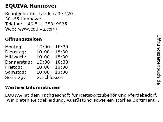 | Öffnungszeiten EQUIVA Hannover in Hannover anzeigen | |
