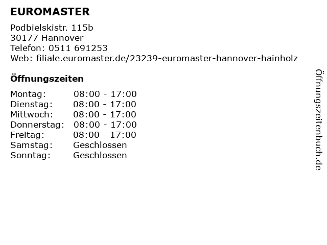 | Öffnungszeiten EUROMASTER in Hannover anzeigen | |