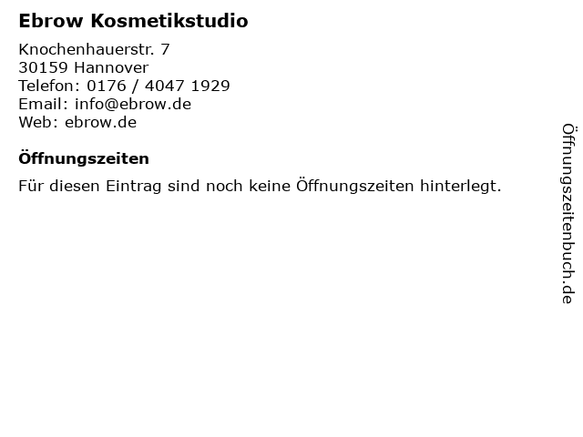 | Öffnungszeiten Ebrow Kosmetikstudio in Hannover anzeigen | |